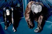 This display features a turntable carrying stuffed orangutans, gorillas and chimpanzees―male and female specimens paired for each kind of animal. The exhibits show the beautiful black hair of the chimpanzee, and the white hair on the back of a male gorilla (called a “silverback”). The specimens also indicate the difference in body size among the primates. The difference between male and female primates of the same species is referred to as that between two sexual types. For orangutans and gorillas, the male bodysize is about twice that of the female. Additionally, male canine teeth are larger than those of the female.