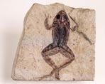 This exhibit is the fossil of a frog excavated from the Kabutoiwa Layer. It shows the shapes of the frog bones, as well as the color pattern of the frog’s spotted skin. The fossil is one of the few frog fossils showing the skin color patterns. It is highly valuable, given the fact that frog fossils showing the impressions of skin are rare.
