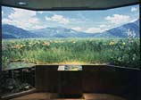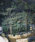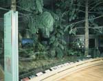 The exhibits, in a 12 m-high room, show the view of a beech forest [of the type characteristic of the Japan Sea side of Japan] on the northern side of Mt. Hotaka. Beech trunks were transported from the site of the Naramata Dam, located deep in the mountain. You see Acanthopanax sciadophylloides and Acer japonicum in the sub-tree zone; and Viburnum furcatum [white flowers], rowans, and Lindera umbellata var. membrancea in the shrub zone. Viola brevistipulata and other flowers are found on the forest bed.