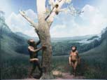 This display features a turntable carrying stuffed orangutans, gorillas and chimpanzees―male and female specimens paired for each kind of animal. The exhibits show the beautiful black hair of the chimpanzee, and the white hair on the back of a male gorilla (called a “silverback”). The specimens also indicate the difference in body size among the primates. The difference between male and female primates of the same species is referred to as that between two sexual types. For orangutans and gorillas, the male bodysize is about twice that of the female. Additionally, male canine teeth are larger than those of the female.