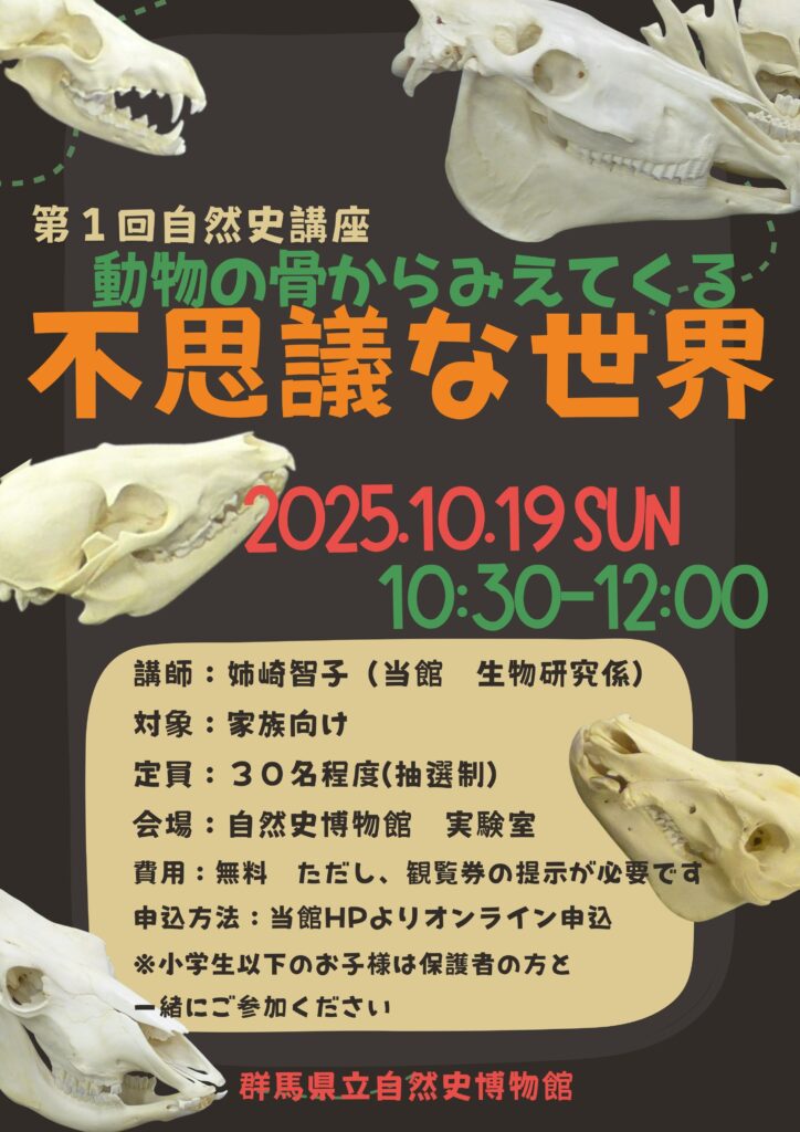 普段、なかなか目にしたり、手に取ったりすることのない動物たちの骨を通して、彼らがどのように生き、どんな暮らしをしていたのかを探る体験型の講座です。