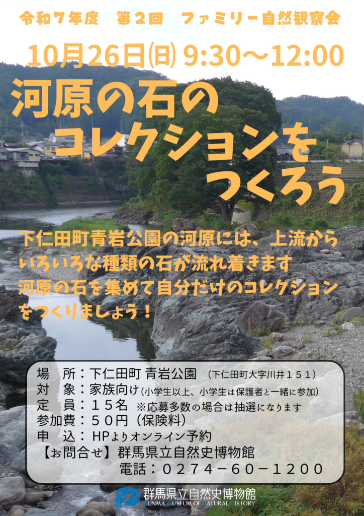 - 下仁田町青岩公園の河原には、上流からいろいろな種類の石が流れ着きます。河原の石を集めて自分だけのコレクションをつくりましょう!