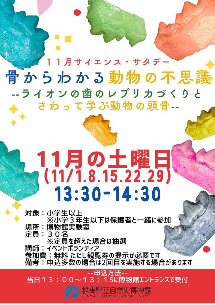 【毎週土曜日開催!!】11月サイエンス・サタデー「骨からわかる動物の不思議–ライオンの歯のレプリカづくりとさわって学ぶ動物の頭骨–」