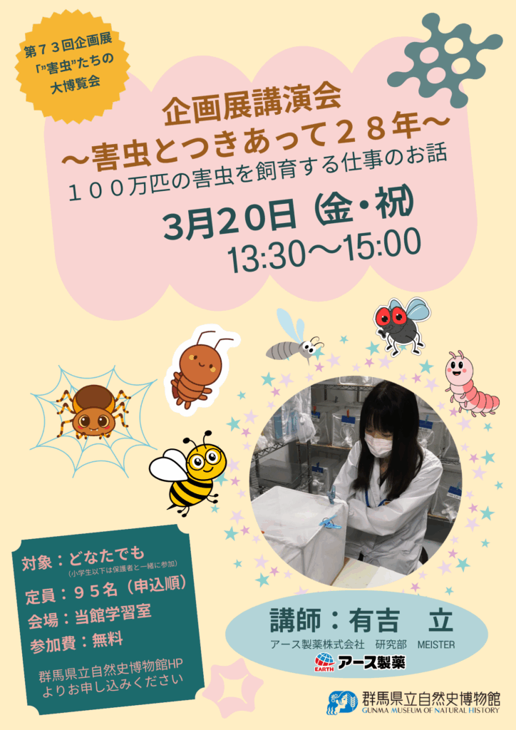 - 第73回企画展「”害虫たちの大博覧会” ~見るのはちょっと…?でもね、意外と気になるんです!~」の関連事業として、アース製薬株式会社 研究部 Meisterの有吉 立氏を講師に、講演会「~害虫とつきあって28年~100万匹の害虫を飼育する仕事の話」を開催します!!