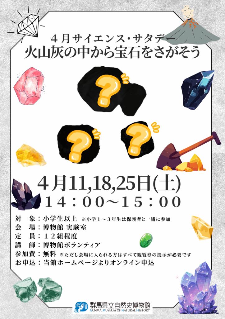 4月のサイエンス・サタデーは、宝石や鉱物の成り立ちについて学び、火山灰の中から宝石を探します!