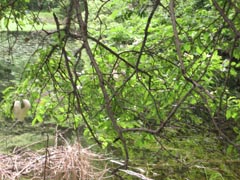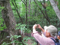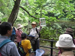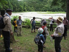 今年度第1回目のフィールド活動は、みなかみ町の古沼、大峰沼周辺でモリアオガエルの観察を行いました。群馬県自然環境調査研究会の金井賢一郎先生を講師に迎え、モリアオガエルの生態や卵塊の調査をした結果など、詳しい説明をしていただきました。古沼、大峰沼ともにたくさんの卵塊が観察できました。また、モリアオガエル自体もたくさん観察することができ、参加された皆さんはその姿をカメラにおさめるなどし満足そうでした。また、今回は、博物館で昆虫担当をしている高橋克之主幹が同行し、昆虫についての説明もあったので、充実した観察会となりました。