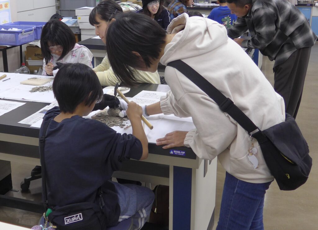 群馬県民の日に、博物館実験室でワークショップ「化石ミニ発掘体験」を開催しました。100名を超える皆さんにご参加いただき、固められた土の中から本物の化石を発掘する体験をしていただきました。