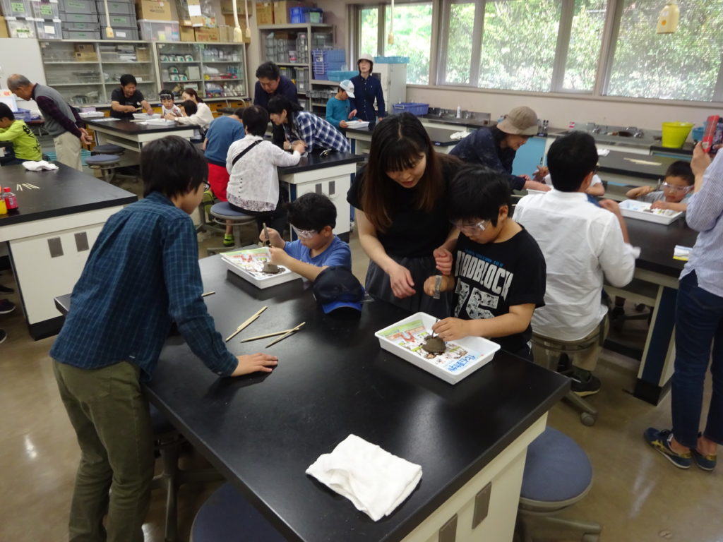 本物の化石が発掘できるミニ体験を行いました。参加料350円(友の会会員は50円引き、総会参加者は、100円引き)でしたがたくさんの参加者に体験したいただきました。当日は、オリジナルポストカードもプレゼントされました。