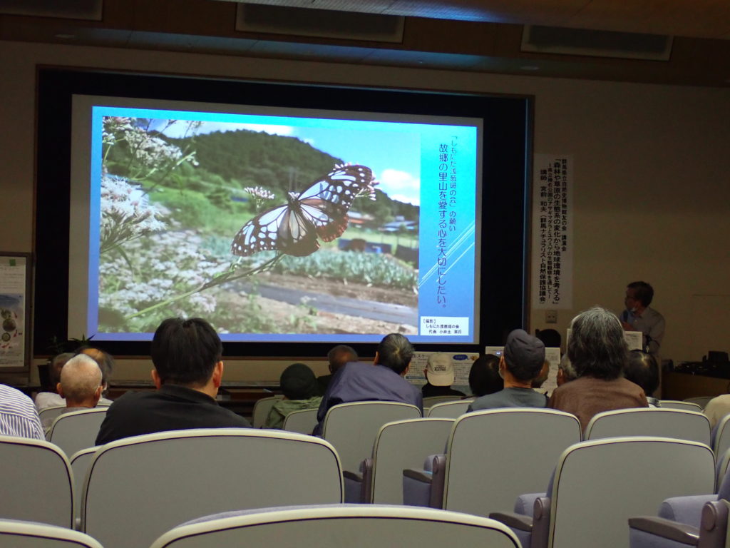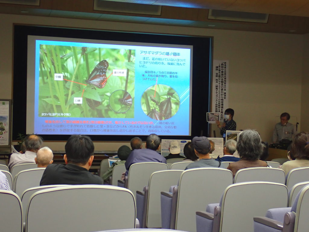 総会の後、群馬ナチュラリスト自然保護協議会の宮前和夫さんを講師に、友の会講演会「森林や草原の生態系の変化から地球環境を考えるー県立榛名公園のアサギマダラとユウスゲの生態観察を通してー」を開催しました。群馬ナチュラリスト自然保護協議会の皆さんが長年に渡って行っているアサギマダラとユウスゲの生態観察や、その活動を通してわかった生態系の変化についてご講演いただきました。